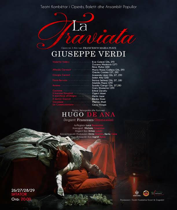 Instituti Italian i Kulturës ka kënaqësinë të mbështesë Teatrin Kombëtar të Operas dhe Baletit të Tiranës në prezantimin e La Traviata, një opera në tre akte nga Giuseppe Verdi.