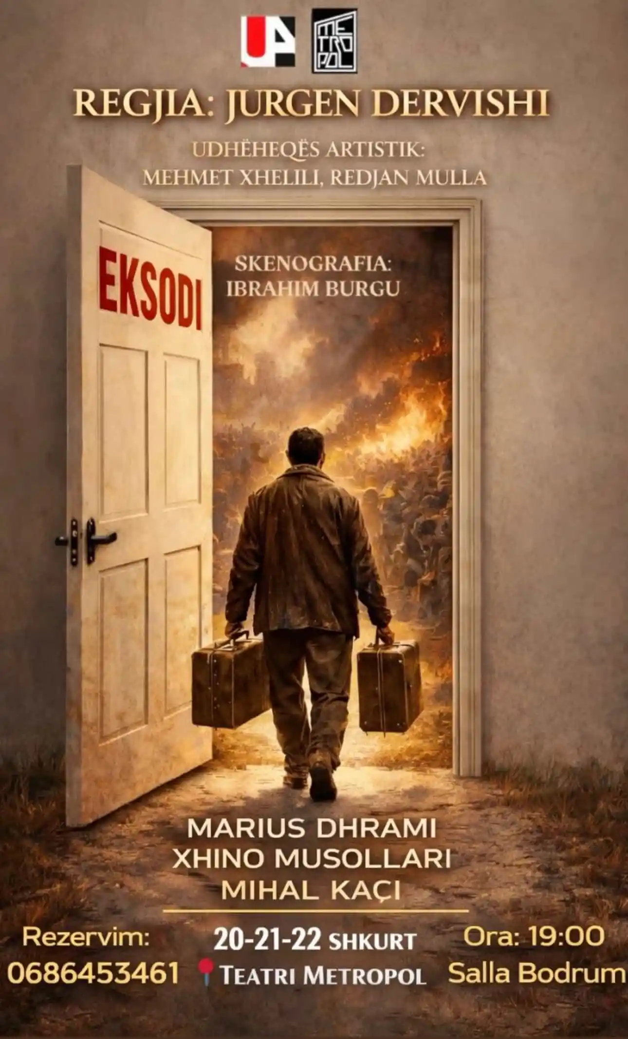 Teatër Teatri “Eksodi” Sindi Shkira 16/02/2026 Facebook Twitter Email WhatsApp Teatri “Eksodi” nga Jurgen Dervishi Data 20/02/2026 Location Teatri i Metropolit Stay in touch Çdo gjë që ndodh në Tiranë, në emailin tuaj. Jo tani Teatër ArTurbina Silvia Tabaku Teatër Teatri i Metropolit Silvia Tabaku Teatër Teatri i Kukullave Silvia Tabaku Teatër Teatri Kombetar i Operas, Baletit dhe Ansamblit Popullor Anja Dervishi Vende tërheqëse →