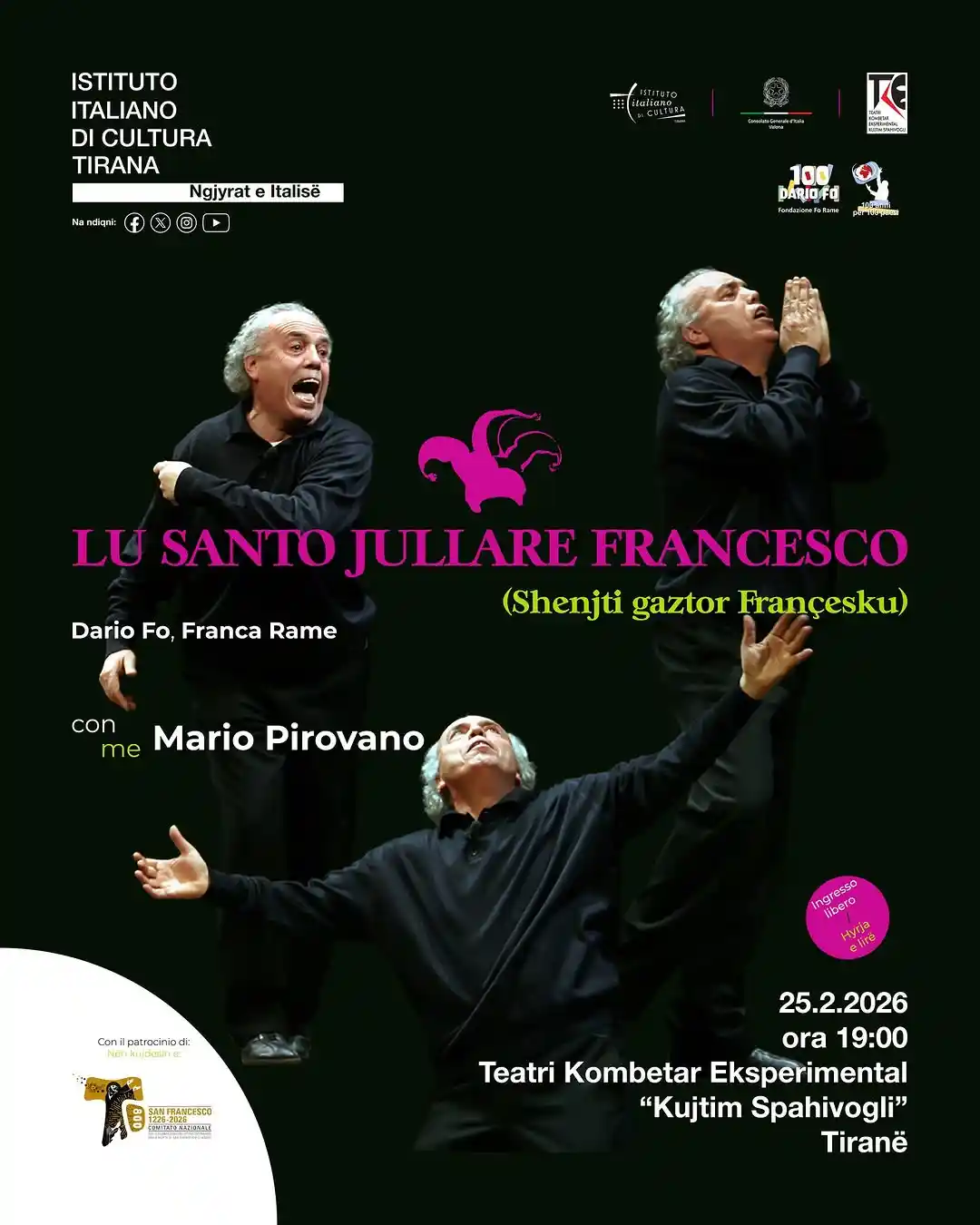 Në përkujtim të njëqindvjetorit të lindjes së Dario Fo dhe tetëqindvjetorit të vdekjes së San Francesco d’Assisi, Instituti Italian i Kulturës në Tiranë ka kënaqësinë të prezantojë monologun LU SANTO JULLARE FRANCESCO shkruar nga Dario Fo dhe Franca Rame, të interpretuar nga Mario Pirovano.