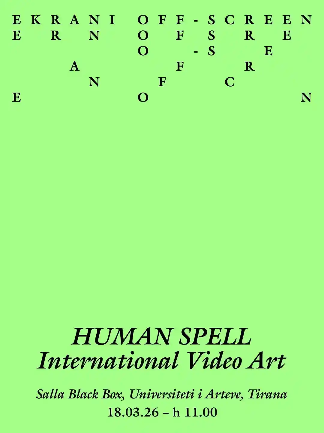 Mezi presim t’ju shohim përsëri në Tiranë me një program të ndryshëm: Human Spell – International Video Art, që bashkon katër vepra që eksplorojnë kujtesën, identitetin dhe performancën përmes rrëfimeve vizuale mbresëlënëse. Përmes ndërthurjes së dokumentarit, koreografisë dhe imazheve surreale në një reflektim mbi kulturën dhe historinë bashkëkohore, njihuni më shumë me atë që shfaq Ekrani i Artit ndërsa prisni fillimin e edicionit të 9-të, këtë vit në Shkodër.